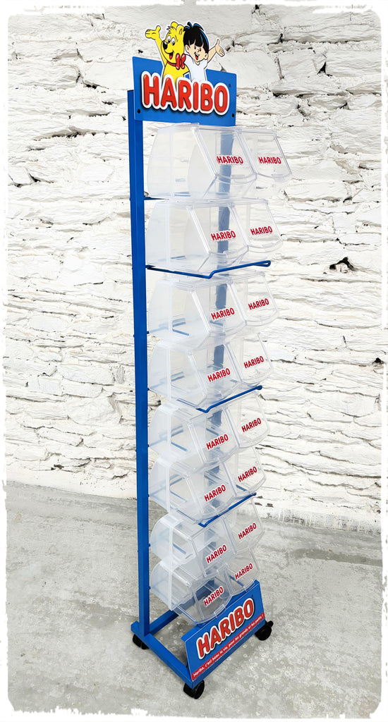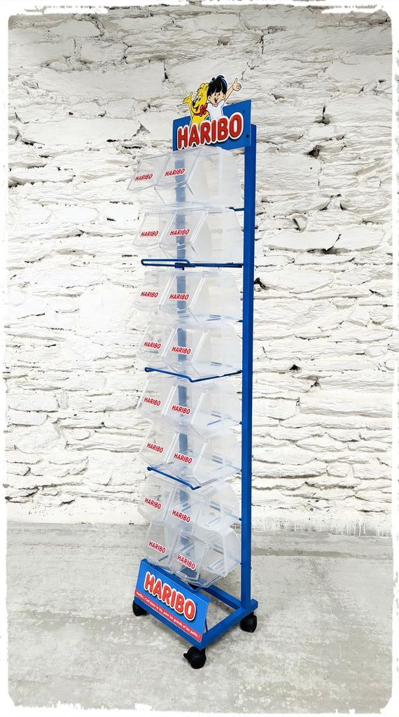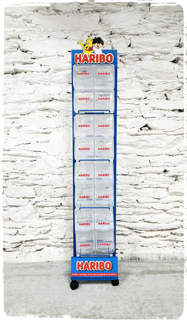Grand présentoir, étagère publicitaire sur roulettes Haribo